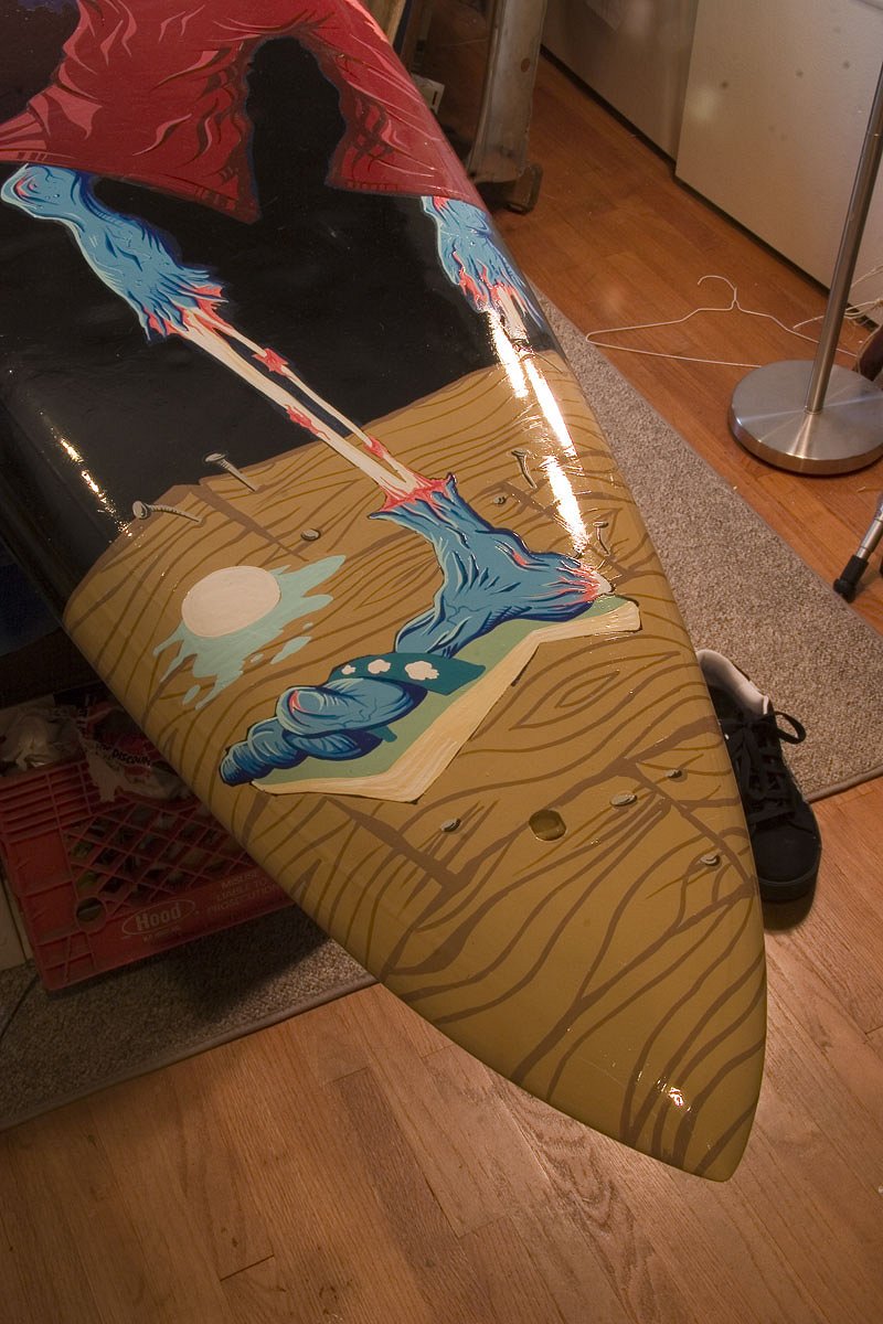 Thanks Mooney!!! Here are some progress shots (or where I am now after loosing my early shots) of the 8' surfboard.... "Make Mine a Zombie" background base is done....now blocking in large areas of color...