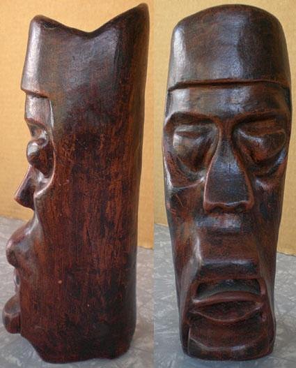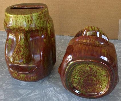 Next we have a couple of Moai snagged from a thrift store in Palm Springs a couple of weeks ago. See what you guys get for just drinking and hangin' out at the pool? NOTHING!!!! Both marked "Hawaii". So what's up with the slots in the tops? Slots are too wide for a bank and the Moai are too tall to hold business cards. Any ideas?