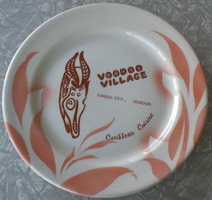 And now, ladies and gentlemen....Direct from Kansas City.....The item I skunked Silverline with. (Sorry mate) The beautiful Voodoo Village dinner plate. Note the sweet airbrushed underglaze. Also you'll see "Caribbean Cuisine" there. I always remembered the joint as Cantonese and Polynesian and at one time I had a matchbook stating just that. The guy who owned the booth said that it started as Caribbean and the fare changed some years later. I'm not sure about that but it sounds reasonable. Anyone else know? Silverline? 8ft?