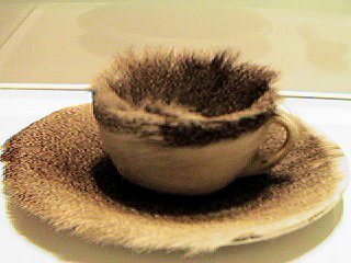 This piece reminded me of Meret Oppenheim's Surrealist fur-covered teacup (1936). |