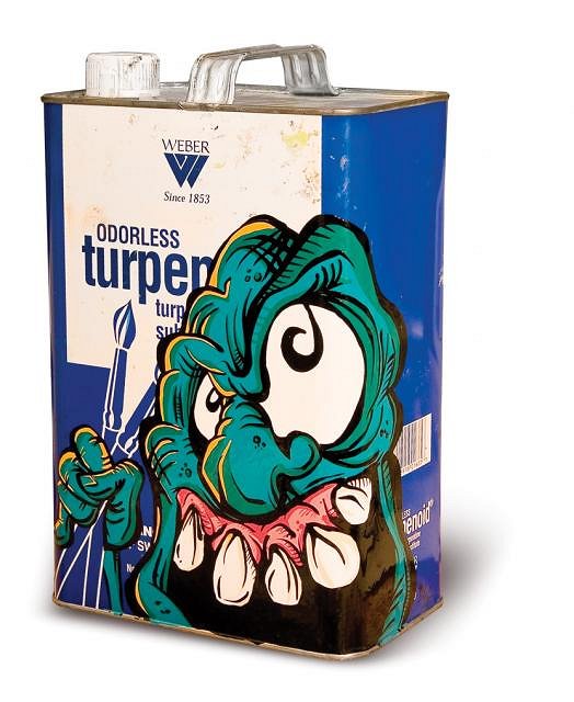 Holy Shnikes, that is the best paint thinner can I've ever seen. I love how you actualyy used the element that were already part of the can and brought that into your designs. Li'l sparky look like a Pollock crime scene with E.T. (that is a good thing!) Keep on trucking. |