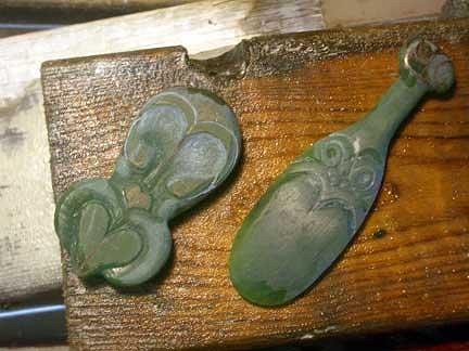 *ALWAYS stay vigilant when using powertools! As for dropping newly finished pieces, I think that must just be something that all learning carvers must go through to test your patience and committment.. :wink: Handheld stone 'clubs'(better described as blades!); basically only Mere were made from pounamu - the kotiati/'liver-cutter' was traditionally made from the wide rib-bones of whale & less commonly from the denser jawbone material. As I understand it, these were used mainly for hacking at the belly/sides and/or for taking off the top of the skull (Ive been told the notches at the sides were specifically for this purpose, but then the name confirms the disembowling-tool theory doesnt it?) Sorry, cant guess what the last piece is that you're making; it looks very much like a naturally beach-tumbled jade beachpebble..? Put those losses behind you (recycling is a great way to 'move on'..) You do have a very nice, crisp style and finish; keep it up - get TIKI! :wink: Tama :) |