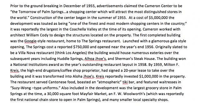 Thank you Dusty and Sven for such great detailed research, although nothing remains of this restaurant I will check this spot out next time I'm in P.S. after going to Sherman's Deli on Tahquitz Way. |