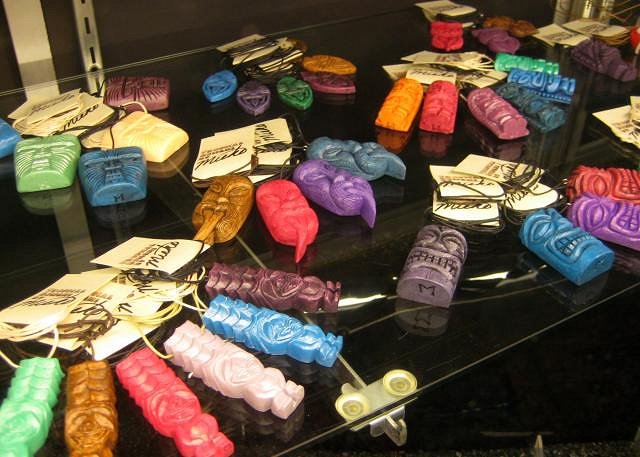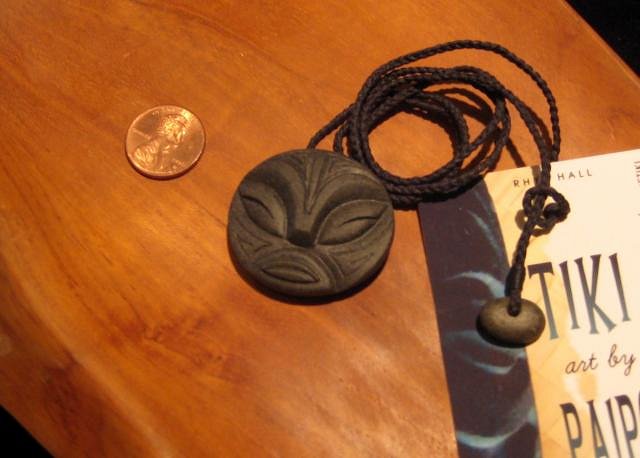Benzart beautiful faux jade maori warrior is one of the largest he's ever made (dig the penny) and boasts a genuine American Alligator Tooth clasp detailed with maori fern patterns. More Ben Davis work is on it's way! The minature Paipo outrigger has landed..... Paipo's Stone kava kava man features beachcombed Rapa nuian obsidian pupils and bone eyes. A stylized war club forms his nose and brow with Orongo rongo birdmen joined at the beak continuing onto the back. I've just learned that Mark Swanson's playful images from Hawaii are on their way. Cross your fingers it gets here before Oasis. AND more MUNTIKI MUNKTIKI MUNKTIKI!!! |