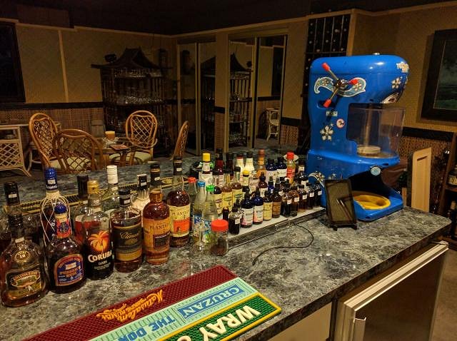 That's a great real working wet bar, which not all tiki bars can be. With the amount of bitters, etc. you have on hand, I can tell you are a true Craft Cocktail enthusiast! My passion as well. Love the ice shaver, a tiki bar that can do hawaiian shave ice is "pretty cool brah". We MUST visit....