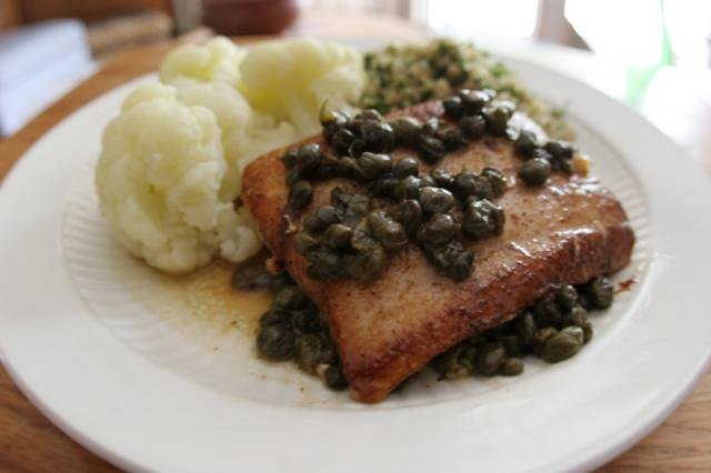Tonight we had pan fried Mahi Mahi prepared with butter lemon capers along side steamed cauliflower and quinoa with fresh dill and lemon.