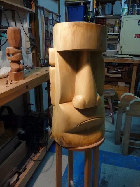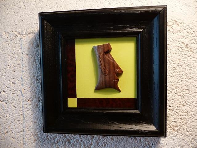 Now, other things from the workshop: First, a pine Moai. Actually a wedding present: A series of walnut carving framed