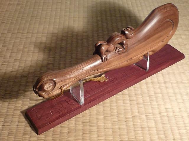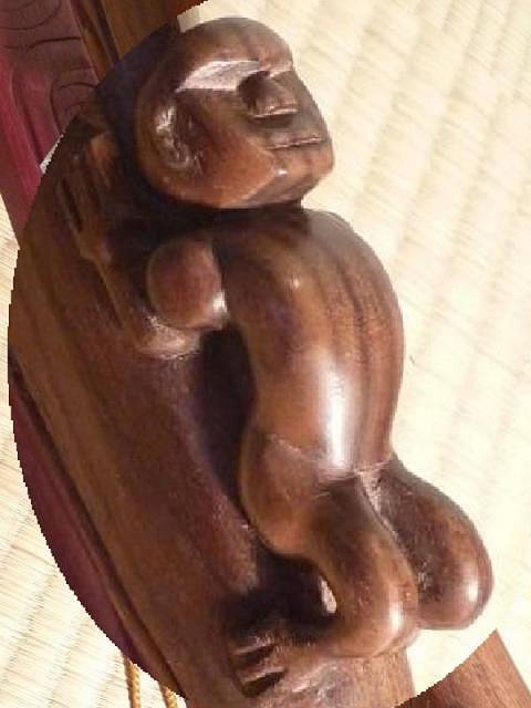 Very busy season... Hi Tiki Central! Some news from France! -Thank you Virani! Back from Aotearoa? Post the pics! :o :o :o -Also thank you JohnCC! Lot of fun to realise this fisherman lamp! -Thank you Hiltiki, I appreciate the comp'! -I'm not so young as I seem... Thank you CY! -Amate hello! I thins linseed oil, by heating, so that it penetrates deep into the woods. I read in an old book that piece of equipment mills (wood) was boiled in linseed oil, which gave them an increased hardness and wear life so much longer. For Wahaika, I polished it when the oil dryed. -I see very well what you mean Tama ... I asked as long, turning the blade in all directions. The documents I found on the adzes are very imprecise. But in a logical way, in the direction of the cutting, it's true that the concave part has to come against the handle. -Wow! Much of compliment from you Sensei carver! Thank's a lot! HappyHappyHappy me too!!! -Hey Clarita! Good to hear you! What's news in the bamboo world? Not much this time, really not much time to sculpture ... The Wahaika on the previous page finally finished Engraved amaranth and polycarbonate pedestal:
