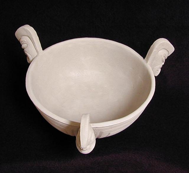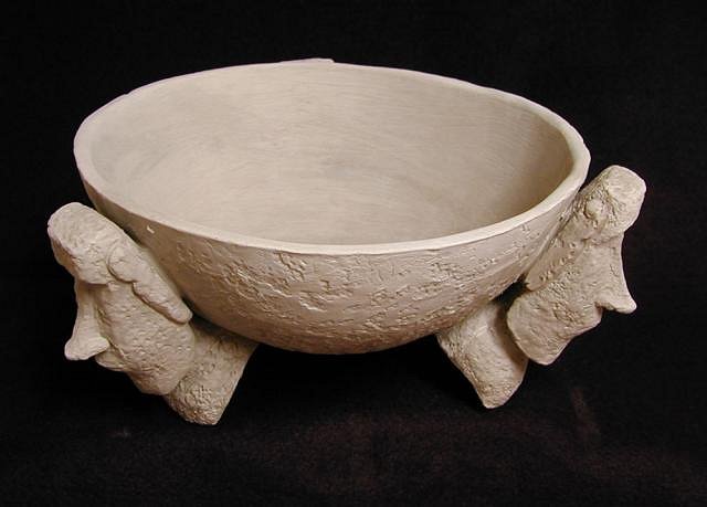 In the greenware stage. The Moai were cast from a press mold of a sculpture I had made previously. They're very thick so the concern was that they may crack off or something. The bowl is hand built from a slab.