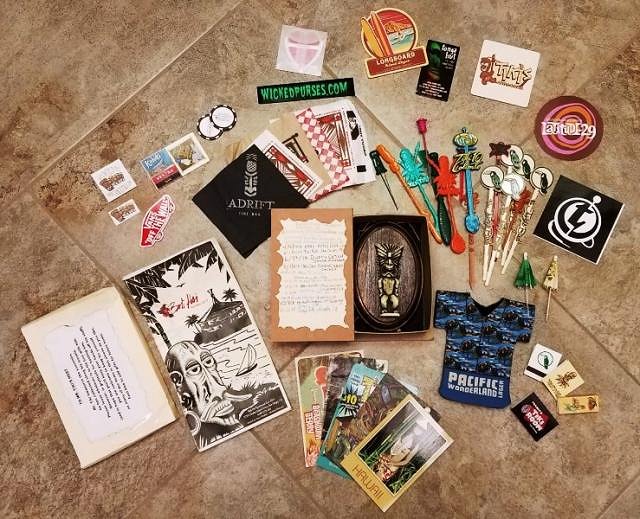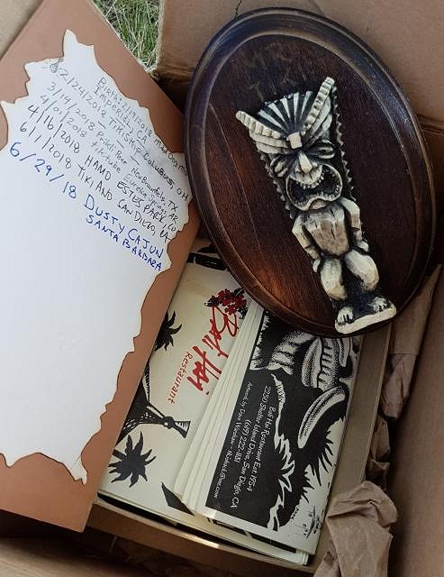 Mr Tiki is between hosts so he returned home for a little rest and a fresh battery in his tracker. Holy Schniky!!! You should see the load of souvenirs he has with him! :oNapkins, swizzles, coasters, matches, stickers, menus, postcard, koozies, and who knows what else!