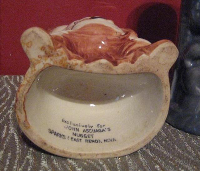 here's this past weekends flea market finds- a mug from the nugget casino in sparks nevada and a home ceramics tiki mug made from an old hawaiian village mug or some such thing- you know the one- it's a yellowish mug with black lines and white eyes. I forget the name of it, but this mug was most likely cast from a mold of it.