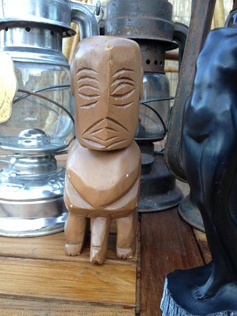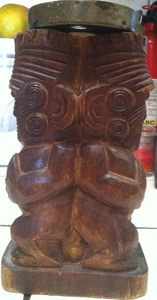 Found this guy a couple of weeks ago. He looks Maori to me. It's one piece with back to back tikis. Someone seems to have tried to convert it into a candle holder and drilled a hole down the center and added an electric plate to catch the wax. That's my guess anyway.
