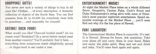 International Market Place was the bomb back in the day (my day being the 80's). Anybody remember Dilip - the guy who would paint designs on folks' fingernails? I remember being at the Market Place bar/restaurant for a few New Years' Eve shows featuring Fat Eddie - that guy was just classic. What an entertainer. And I remember picking up a VHS copy of Elvis' 68 Comeback Special in the Elvis shop upstairs. Even the food court in IMP was awesome. I haven't been there since 2001 and by that time Waikiki had lost its old school laid back charm, in my opinion. But I guess you see things differently as you grow older. Booze helps this (I am drinking a Jungle Bird in a vintage Do Ho glass from an IMP show currently).