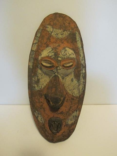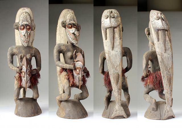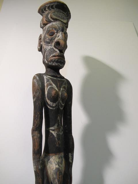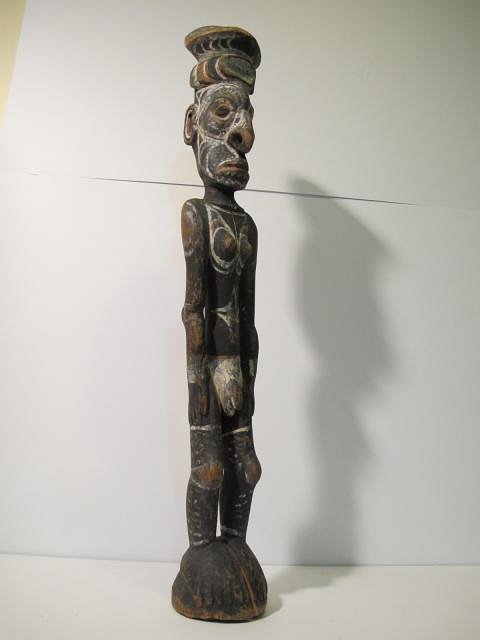 SCORE! found this hidding behind junk...supposedly bought from an elderly collector who brought it back from papua new guinea in the 50's...stories are stories...but....def sepik region. old wood, damaged and bug damage....still probably a piece meant for sale but that doesnt make it any less awesome! 20 inches tall
