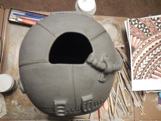Wish List #8 Phase Four continues with some twists. I will eventually show the helmets as they were in the past with skulls but first I'll show some other designs. Once I have these fired and glazed then I will go down the list of wishers and let them decide it there is one they want.