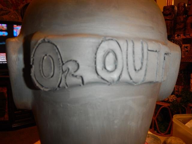 I then glue on a slab of clay and outline the O2 Out with a spike.