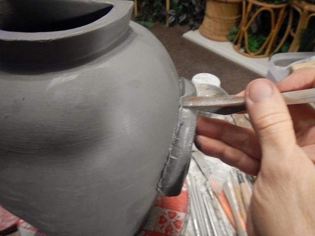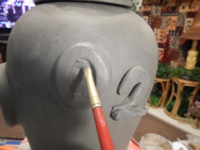 Once she was pressed into place I cleaned up the excess glaze. She went back into the kiln with the next load.