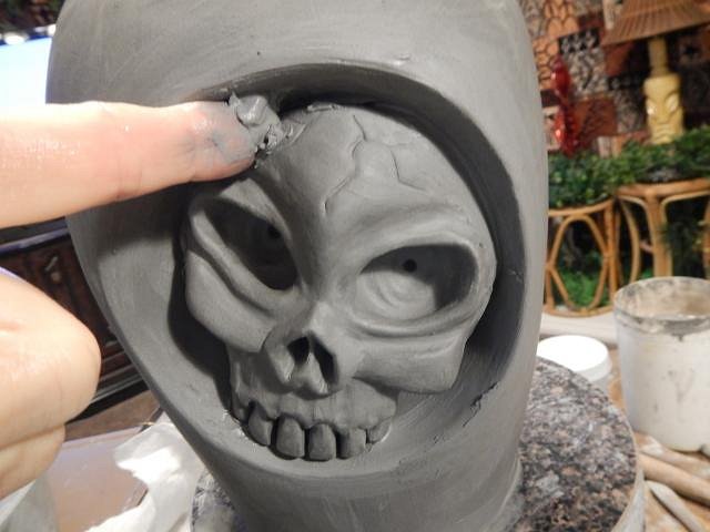 Slowly I remove clay from the backs of the skulls until they will fit into the helmet.