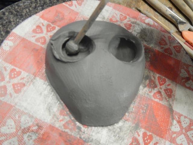 Dan told me to add a third eye. I did that and then I added the head to the helmet and sealed it with sticky clay.