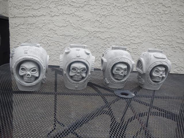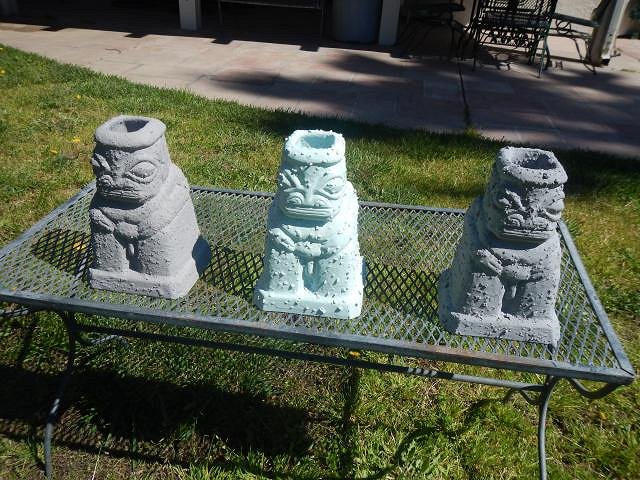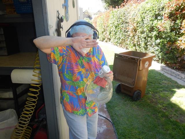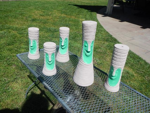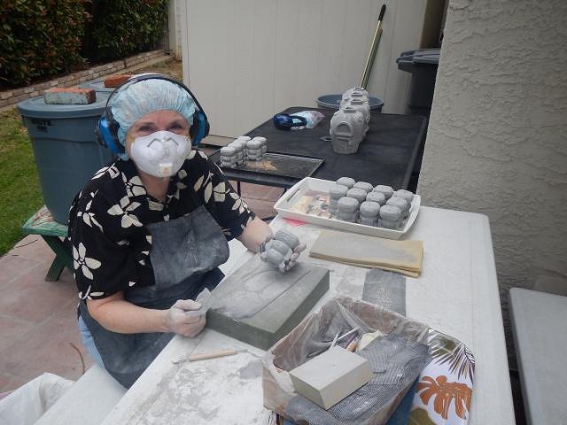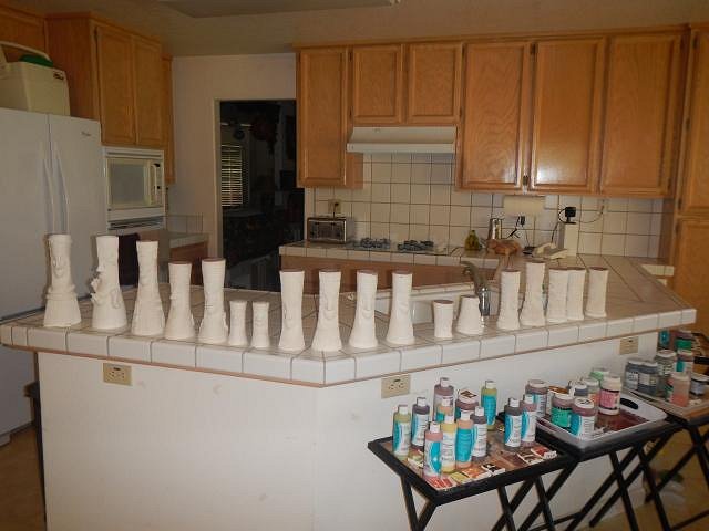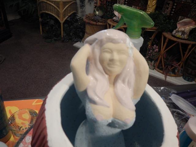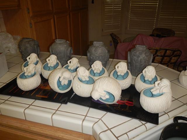 hang10tiki seeing my Tiki Bob's in your photos is like seeing a photo of a relative. I'm glad your speakers work well. =============================== Wish List #8 Phase Four has all been bisque fired. Here is the last load. If you didn't see your wish posted then I haven't gotten to it and hopefully by the end of this year I will be sculpting again and working on Phase Five. I don't think I will ever be done. These Harvey's shakers had to be done. So all the last pieces of Phase Four were taken out to the back yard for sanding. The last four Diver's Helmet finally dried and were ready to be fine tuned, sanded and fired. Dan is the star of my show because I always look this wonderful while working and I don't want to show off how lovely this hobby is. Dan dusted and we filled the bottom of the kiln. He dusted what was left and when it went into the kiln there was room to spare only I had nothing left to fire. Two days later we scrubbed it all and took it into the house. Now I have a home full of projects to glaze. First I will do the Sacramento Crawl mug since it has a deadline. Then on to the Wishes. Wendy |