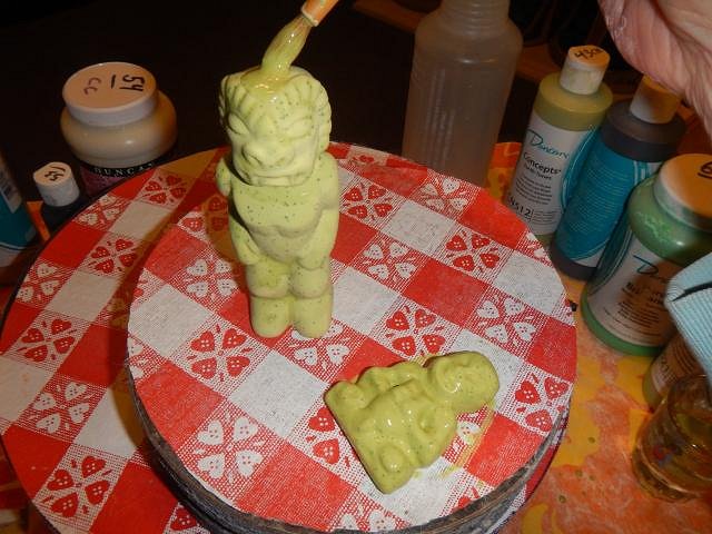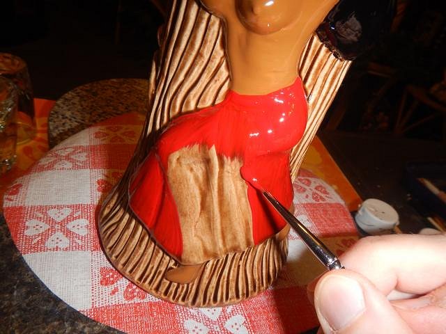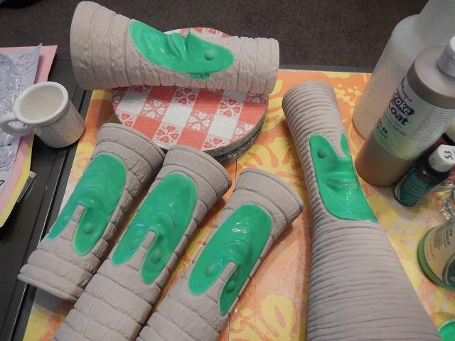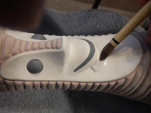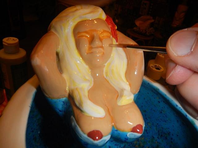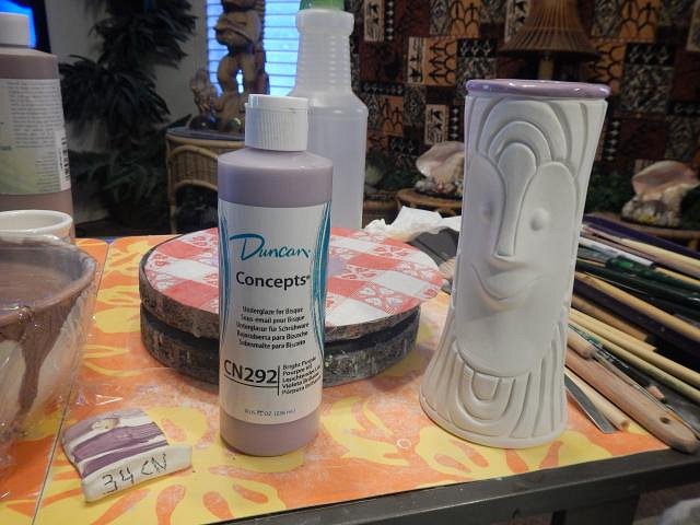 Sandbartender it's funny but once something is done all the past fails and work memories fade fast. I'm so happy you liked him. MadDogMike all the problems came from the black liner which was an underglaze which moved when it shouldn't have. The colors stayed in place, they were Duncan CN glazes. But I love your technique of firing before you do the clear glaze and then dunking it in water to check if the layers were thick enough and how they were placed. ========================= More glazing catch up photos. Fast and furious! I picked out the Tiki Bob's so I could do a glazing marathon.