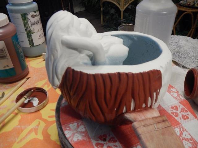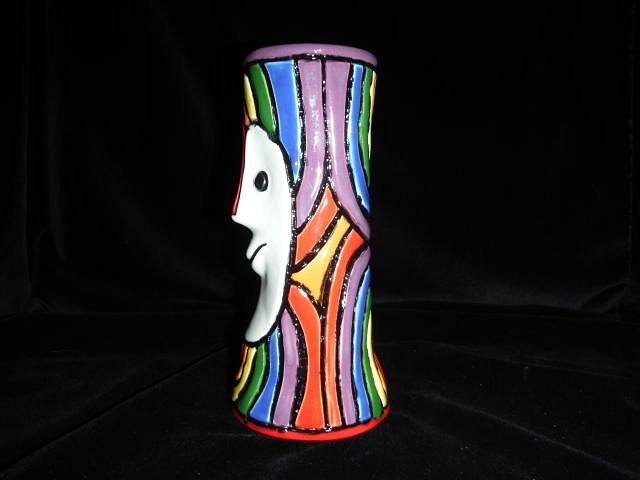 hang10tiki that last photo was a good one. We now have three friends with melanoma. One is stage four and one has had six removed. All were fun in the sun people. ============================ I'm back to doing catch up photos of my glazing progress while I also glaze the Sacramento Crawl mugs. Here's what else I've done. I always to the water line several extra times. This makes a barrier to prevent the skin glaze from moving down. I use an under-glaze but it still moves. I then do all the bottoms leaving a small box for numbering the mug. I do them all and leave them to dry before I do the next step. I had forgotten to glaze the opening so I just stood at the counter and did them all. Next I did the sides. Then they sit until completely dry. I had a wish for a Zombie Torch mug. Great because I had one flame left. I will make them as mug with a regular top but I'll not make the flames again. Glazed in brown and ready to fire. The Tahiti mugs are in our next garage sale. We don't have enough yet but he'll purge one more time. Just one little glaze skip and I'll have to glaze it and re-fire. If the glaze goes in too thick and cracks when it dries the cracks do not heal they cause huge glaze skips. I already re-glazed and fired this mug and all the skips went away. It's really fun when one of your mugs sells for $100 more than what you charge. I did a marathon. I finally did some black velvet photos of projects. Now I can put them onto my gallery page. A Tiki Bob wish that has gone to his new home.