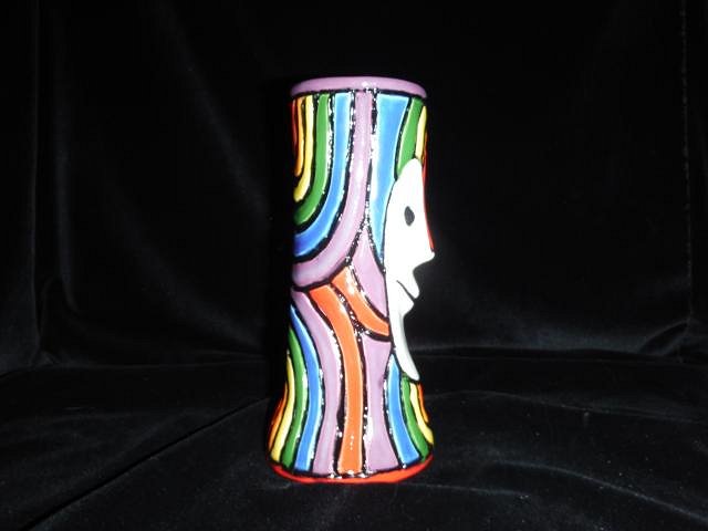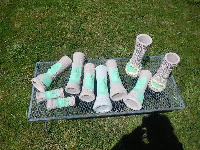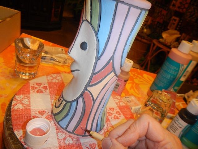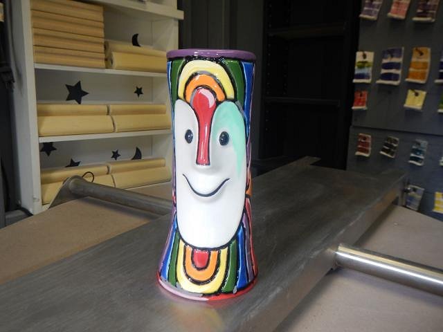 Hamo yes, the three tallest have sold and shipped out to Eric Allred who will wire them for use at his home. I don't wire them. ============================================= Wish List #8 Phase 4 continues with a mug that was a challenge. Here are some of the many steps. MadDogMike would have done a perfect mug without problems. He would have used underglazes. Then he would have fired it and when cool dunked it in water. That would have shown him if there were any imperfections. If not he would have painted on the clear glaze and fired it the last time. If I had a small kiln I would have done his wonderful method. Instead I did a whole lot of work and ended up with a less than perfect mug for which I charged half of what I would have if it had turned out better. Here are my messy steps that I DO NOT recommend anyone follow. That is why I pulled them out of my glazing catch up files because they were here there and everywhere in them. These steps were done from 5/1/19 to 5/28/19 with work done almost every day. The Rainbow for the LGBTQ community was the inspiration requested. I found the glazes that were close to the image. I would do a layer and put the mug out in the sun to dry and then I would do more. Each color had to be done in three layers so I was in and out of the house a lot. This is the mistake I made. I felt that where the groves were the glazes didn't come together in a straight line. I asked if I could separate each color with this black liner which is an underglaze. The answer was yes so I proceeded to draw it in. It was a bit wobbly. Once it was finished I let it dry and then did some touch up glazing. I checked it over and I was happy. Once the face was done and it was all dry I glazed it with three layers of clear. When it fired the black product moved and made defects. So Dan dremmeled them off and I re-glazed the mug and we fired again.