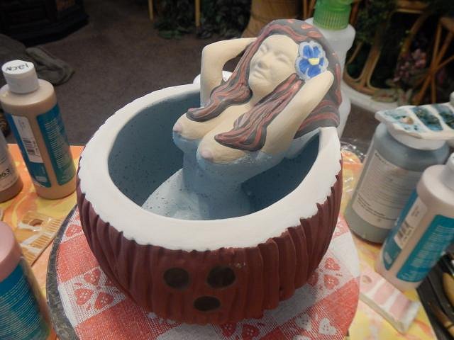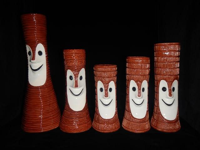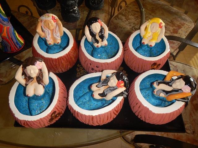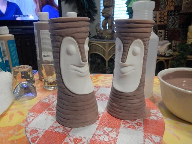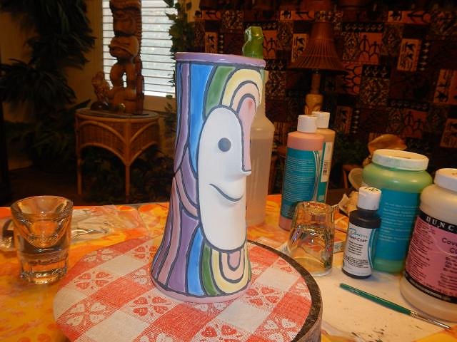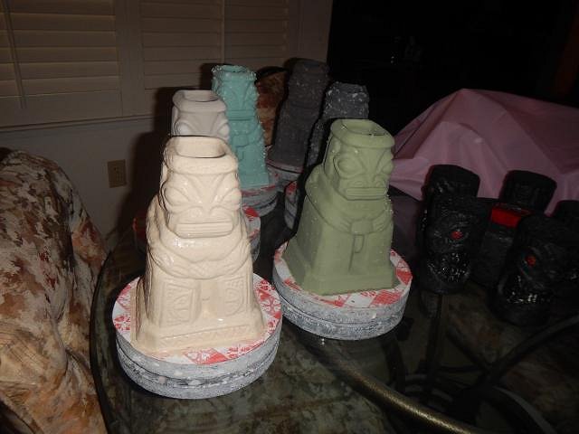 hang10tiki the best time to swim is in the dark. Drunk tikis never drive. ==================================== The catch up glazing photo marathon continues with these from 5/6/19 until 5/8/19. I hope I retire before I run out of Liquetex Glossie enamel paint. They stopped making it. I will buy pin-striping paint for cars if I do run out. The Hot Tub Hula Girls are out of the kiln and waiting to be inspected. Meanwhile all of these Tiki Bob's went on to their new homes. I wanted a group shot. The four mugs on the right starting with the pink one are still for sale. I checked and every single one of these mugs needed to be re-glazed and re-fired. It's always that way. If you put on too much glaze it runs into the water. Not enough you do it all again. Glazing does go faster the second time.