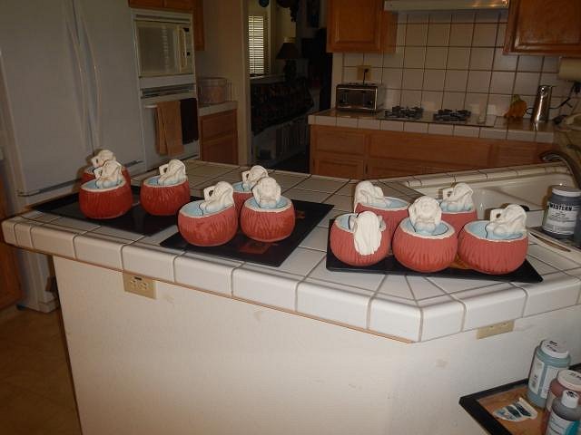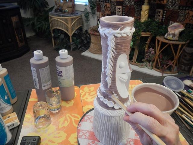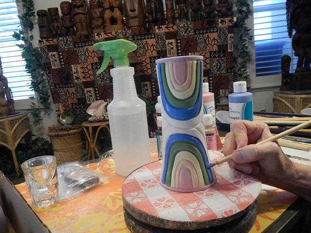 hang10tiki those photos are a dream come true for me. I am going to share them on fb. Hammo every finger I have works clay and Dan's touch vinyl every day. But paper tape saves the day. ========================================= More Glazing Catch Up Photos. These were taken 4/11/19 until 4/15/19. There's a lot of walking when glazing. In and outside, to the garage for glazes. To the sink to wash up. Here's a few of the steps taken during those five days. I glazed the Tahiti mugs that were cancelled. They are now in the latest garage sale we are slowly adding too. Scrabble likes to spy on me but I caught her. I show one but I did six one layer at a time until three layers were done on each of the six mugs. To hurry up the process I put them in the sun to dry. If you do this and see cracks in the glaze form those cracks will turn into glaze skips. So what I do is scrap those cracks down to the bisque and re-glaze those areas. So if the glaze is thick let it dry slowly rather than in the sun. Wonder how I figured this out??? I do the Hot Tub Hula Girls in waves. First I do all the insides and then clean up all the overrun areas.