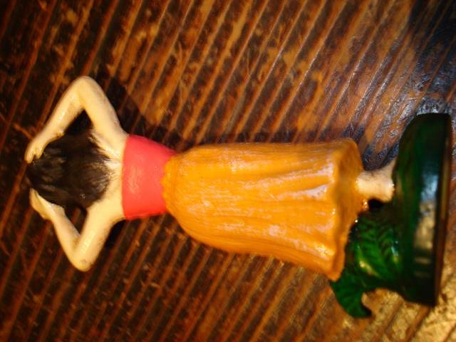 OK not so sure about this bottle opener / cast iron hula girl. Here's the story of mine. I bought her from a store in New Jersey - it was a nautical store that was going out of business so everything was half price and this was back in 2004. From what I remember she was in area of the store with cast iron figures mostly the same size I think there was a mermaid and a fisherman guy in the yellow coat / pipe ect. I also want to say they were packaged in multipule holders like they were shipped together from the same company sorta like an egg holder / something you could hold matchbox type cars in. There was also the Large cast iron girl in the same area, but I'm not sure if they were from the same manufacturer. It didn't seem like this was a "special" find since there were so many of the same type cast iron figures in the store. If it matters the store was located in Long Beach Island and sold new and a few old/antique items. I think with the previous link to the online store and fact that these Hula girls did not seem like crazy cool Nautical treasures (that could have been th ename of the store by the way) I'm doubting that they are very old like from the forties or earlier. Don't get me wrong they are cool I'm just trying to shed some light on what I know.