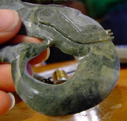 WOW KS, Mighty fine stuff there. This is an Awesome dragon for your second piece? Great hunk of Jade too. What tools are you using and are you running water on them while grinding away? You are definitely doing Something right to have come so far in so short a time. The ripples need to be gone over with Larger tools and try going from different directions, against the ripple so to speak. |