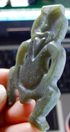 Kia ora KS. - missed this last piece. A Tiki!! Yay! Im afraid it's a bit hard to tell what sort of jade you have there. Keep more piccies coming as there is progress & I might be able to tell you. It may be some months before your new wheel calms down a bit; good chance to grunt some really heavy forms out though.. Keep that wheel spinning! Tama :) |