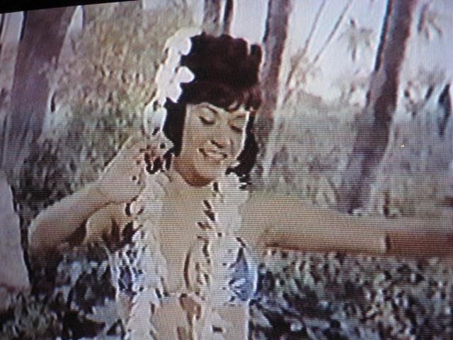 I could never hope to interest any of you here with my measly mug and decor "finds." But I do have a pretty cool collection of Scopitones! And because these proto-music videos were being made at the height of Tiki culture popularity, several have Hawaiian themes. Recently I was watching Princess Leilani in "Keep Your Eyes on Her Hands," and I took some screen shots with my digital camera. I thought I'd share. She's so pretty and has such a sweet smile.