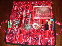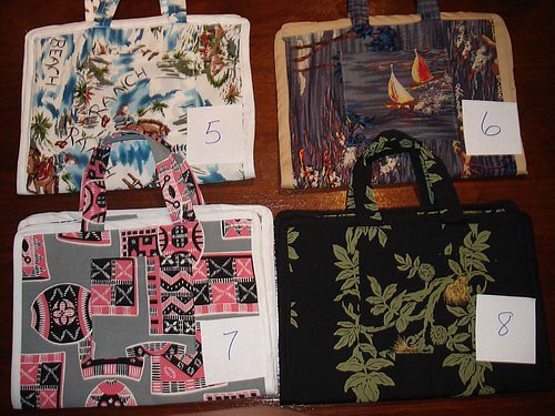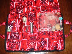 How many of you go to someone's party and wind up behind the bar (by invite or by choice) only to find out that your host bar is woefully lacking the tools you need to make the perfect Mai-Tai or Zombie? Well, here's the answer..... As seen in action at the 2007 Hukilau After Parties and presented to you by popular demand: **Gumbo Limbo Traveling Bar Rolls. Each hand-crafted Bar Roll includes generous inside pockets to hold your knives, juicers, bottle openers, swizzles, measuring glasses or jiggers, and a small cutting board, as well as an outside pocket large enough to hold your 'little-black-book-of-recipes.' Each Bar Roll includes an internal flap to prevent your tools from spilling out and folds to a handy carrying size complete with matching handles so you can show up behind the bar at your next party in style and make drinks like a pro. The Gumbo Limbo Traveling Bar Rolls are being offered as a fundraiser with all sales proceeds going to the Humane Society of Broward County. If you would like to make a direct contribution (and we hope you will) you can find more at http://humanebroward.com/donation/index.htm Each Gumbo Limbo Traveling Bar Roll is available for only **$25 **(shipping included) while supplies last. Each one is unique so pattern selections are available on a first-come-first-happy basis. !! #3 is sold And here is what they look like fully loaded: