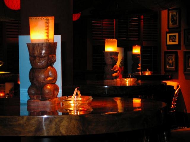 I couldn't really go all the way to Shanghai, and not visit Trader Vic's. Approaching the front, one passes 3 large tikis guarding the place. Not content with that, there is a doorman with a radio headset who informs the hostess of incoming guests. Upon entering, one sees a foyer containing several more tikis including one that makes use of tree roots for the hair. Heading up the stairs leads one to the hostess desk where depending on your desire, food or merely drinks, you are lead to one of the dining rooms or the bar. There are several dining rooms and three additional banquet rooms — the Captain's Room, the Admiral's room and the Trader's room. Large tikis and masks are scattered throughout. This is one luxurious restaurant. The largest concentration of tiki decorations is in the bar area. I was particularly taken with the maori-styled candleholders. (Though unfortunately none were taken BY me.) The large dance floor is set in front of a stage which hosts a band on certain nights. The domed area above the dance floor has a canoe and copious decorations, but I would have needed a fisheye lens to photograph it properly. When there's no band, and even when there is, salsa seems to be the music of choice. The cocktail waitresses, mostly Filipino gals, were friendly and chatty, but not intrusive and were dressed in lovely sarong-type dresses. I had no complaints about the food. On my first visit I had an Australian rib eye steak, which was tasty, though a little fibrous. Sometimes that's just the way a rib eye is. On my second visit I had a pork chop with garlic mashed potatoes and it was delicious. My dinner companion and I split a chocolate soufflé for desert and it was a delight. Drinks were overall solidly, though not masterfully made. On my second visit, since my companion wanted to learn how to make a Mai Tai, I had the bartender line up each of the ingredients in shot glasses on the bar, had my companion pour them in the shaker one by one, sniffing the mixture at each stage, and finally had the barman shake it up and pour it. (I had to bruise the mint myself.) This was compared with the standard Trader Vic's Mai Tai Mix version they serve and the verdict was clear: old school all the way. We gave the bartender a nice tip and hopefully he'll be able to make these for others in the future. All in all, a pleasant evening each time, though I would have like to see how busy it gets on a Friday or Saturday night, but alas, I was otherwise occupied on those days. Perhaps on a future visit.