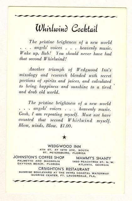 Hey... I need help on an old drink recipe if possible. I have a small bar in Northern Indiana and I am always in pursuit of old school cocktail drinks for our restaurant & tiki bar, Noa Noa Wood Grill. While I was on my honeymoon last weekend in New Buffalo Michigan I purchased a wood bound 1932 Cocktail bar guide and an a great antique post card from the Creighton's Restaurant in Florida ( They had 4 locations at the time) from 1962 describing the Whirlwind Cocktail. To my dismay no ingredients are given but for a $1.25 the many descriptions are very inviting though...