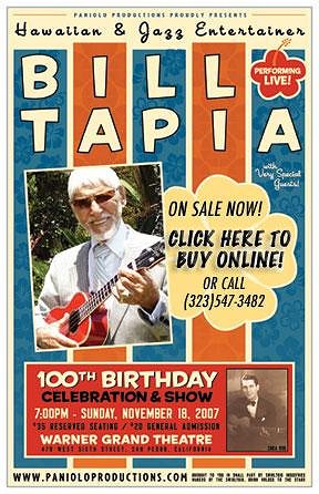 Join Bill Tapia and many other performers in celebrating his 100th Birthday!!! At the lavish, art deco WARNER GRAND THEATRE TICKETS ON SALE NOW! NOW ON EBAY! Direct link to auctions can be found at: Bill "Tappy" Tapia has lived his life as a Hawaiian and Jazz Entertainer for over 85 years and still remains one of the hardest, longest working musicians under the radar. Along with his chops, charm, keen taste in fashion and love of cars comes his flawless mind and sense of humor. "As delightful as it is surprising... Tapia's 86+ year career includes jams with long-gone pioneers of American music, including Louis Armstrong, Billie Holiday & Fats Waller. Other links to visit: SEE YOU THERE! |