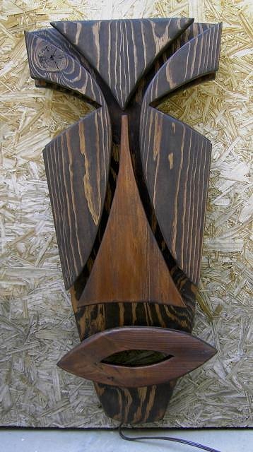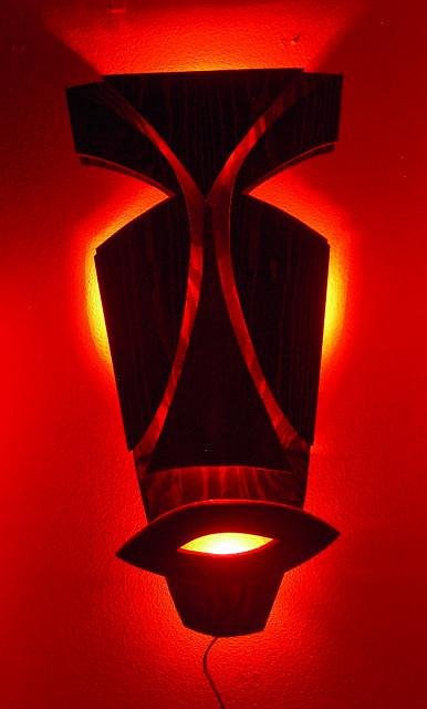 Up for auction is the beautiful hand-made tiki wall sconce light “Momaka Tiki”. Designed and created by Leonardo DaVelvet for MidCentury TIKI. This hand carved, backlit wall light measures 31 inches tall and 15 inches at its widest. Beautiful deep stain with red or green colored glowing light. You can use any C7 bulbs to set the Tiki mood. Ready to hang with a 6-foot cord. Beautiful by day…amazing at night. Fine Polynesian Pop furnishings & decor from MidCenturyTIKI. Quality one of a kind, hand made items, true to the style of Polynesian pop in a classic, yet 21st Century style. “Witco meets Shag meets Z Gallerie” Beautifully designed and quality made with new and antique woods. Truly created by people that “know” Tiki. http://cgi.ebay.com/ws/eBayISAPI.dll?ViewItem&item=360047225554