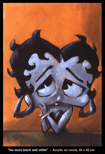This is the first painting of my new theme show of acrylic paintings that I'm working on...this exhibition will be called "CARTOON CHARACTERS"...this is Betty Boop, the title is "No more black and white"...lots of toon characters will be painted in different painting styles, like e.g. the "rendered" and the "flat" style...