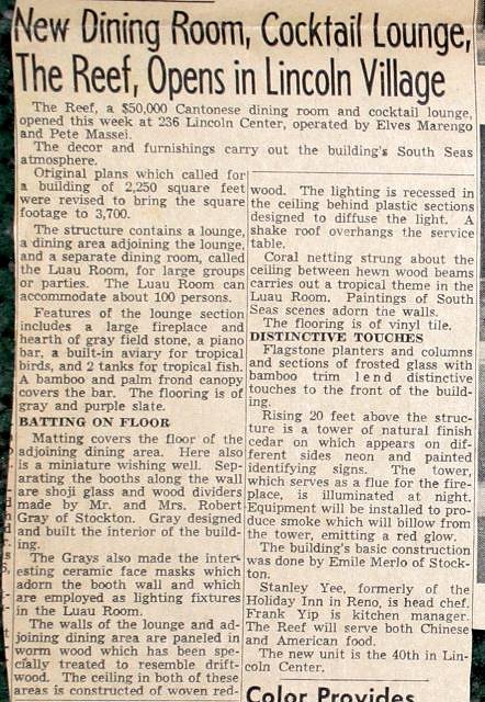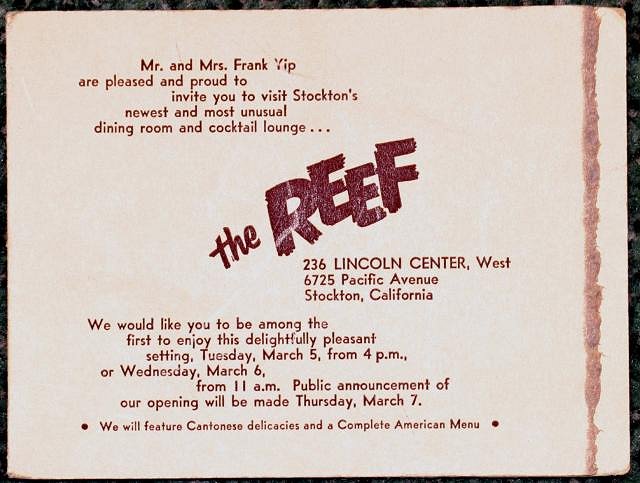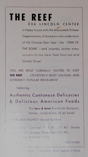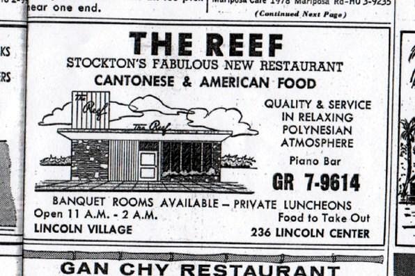 The ad appeared in the 1968 Golden State Telephone Co. phone book. so I guess 1968 was end for the Reef restaurant in Stockton.