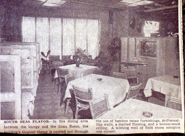 Onward I went and found these two pics from 1957. One of the owners in front of a fire place and the other is of the Luau Room. There was two 10x4ft paintings on the walls done by a local artist named Kim Leow. He was 34 years old in 1957. The restaurant cost $50,000. It featured a built in bird aviary and two aquariums. There were ceramic face masks in the interior made by Mr. and Mrs. Robert Gray. The tower sign was 20ft high and included the Reef name in Neon. It was also a chimney for the fire place.
