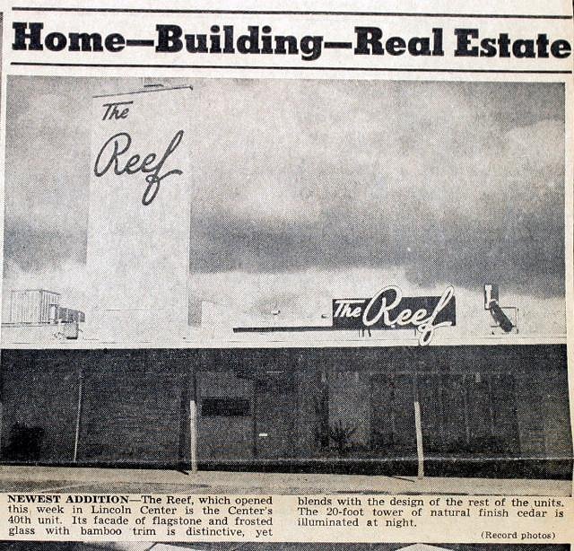 A few days went by and I was thinking about the place a lot. I went back out there, dug around a bit and, with the help of an old high school friend, managed to get my hands on a 1959 Arial photo of Lincoln Center that shows The Reef restaurant sign.