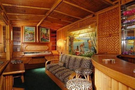 Every inch is covered in bamboo product, including the floor, the chairs, the tables, the bar, even the swinging doors in the back. It's like it was built by Bamboo Ben on steroids (or Budwiser)! No white walls! The only thing they missed was the ceiling, but at least they painted that brown. A few other bars that come close to this bamboo nirvana: Early postcard from Steven Crane's Beverly Hills Luau with the bamboo covered bar area.