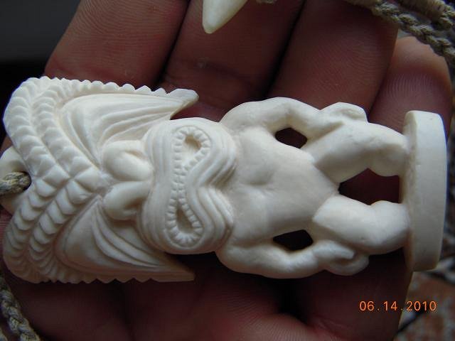 Malo 'aupito to you all for the compliments. I'm only inspired by all of you who contribute your trade secrets on this very informative site. Had it not been for me accidentally stumbling here I would have never progressed 1/2 of much as I have now. Here's a Kanaloa Pendant that I've been working on. Took about 9 hrs. of dremmel carving & 7 hrs. of filing/sanding. I used the small dental ball burr to carve out most of the body. For the face & head I used the cylindrical and wedge looking shaped burrs. It measures 3"(76mm)L x 1 1/2"(39mm)head width, 1 1/8"(28mm)base width x 3/8"(10mm)thick.