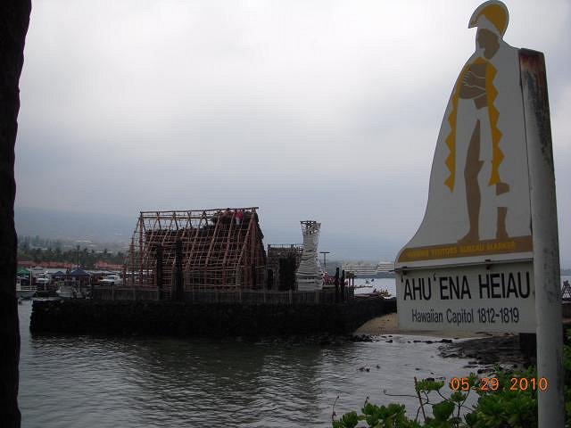 Upon this great stone paepae(platform) stood ‘Ahu’ena Heiau, rebuilt by Kamehameha the Great as his heiau(temple) of the Hale O Lono(House of Lono), type. Dedicated to the god of peace & prosperity. Help from the gods for the King & his people was invoked at this site through the appropriate rituals & food sacrifices. ‘Ahu’ena was not a place of human sacrifice. It was actually the center of the Hawaiian capitol between 1812 to 1819 when Kailua Kona was the capitol of Hawaii.