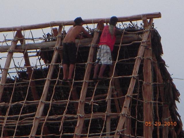 Then these 2 fellas would lash the thatched panel(stick) to the the roof framework/scaffolding. |
