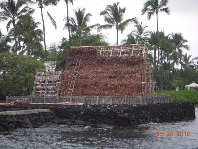 Hale Pahu - house of the drum(little A-framed structure left side) sheltered the great ceremonial drum of the temple. The structure is thatched with hala(pandanus) leaves.