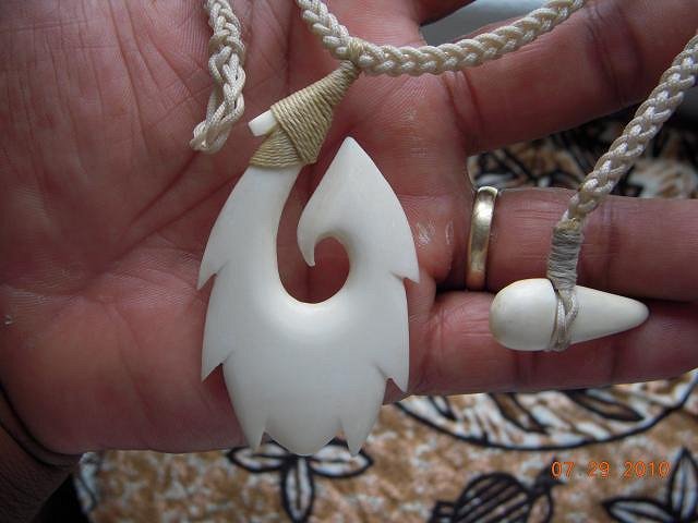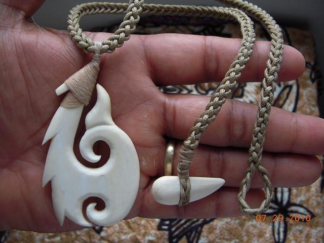 This one I am not done sanding yet. It's just a rough carve done. I just lashed it to see how it would look like on the necklace. I tried out the new micro paracords, about 2mm diameters that I got from the surplus store. They're my favorite, they look good & they don't take as long to braid because of the larger size. These necklace cords were braided from six plaits. I then lashed the fish hook pendants. I drew an instructional diagram for the lashing. https://acrobat.com/?i=1aGL7aih3WewHP01PyOgkg For more info on how I lashed them on, see the Bone Carving Q+A thread started by Tiki Duddy, page 6, post submitted by me. |