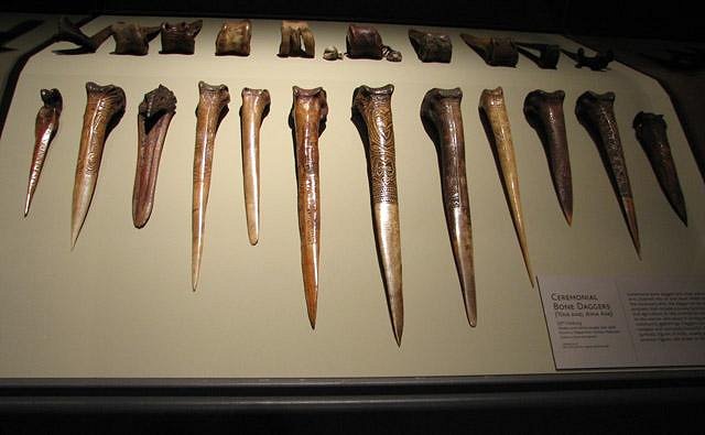 :down: Easter Island Artifacts :down: Majority were Melanesian artifacts, but several cases of Polynesian: :down: Many, many cases of smaller ornamental pieces, including my all-time favorite, that I've only seen in books until now - Necklace of Sperm Whale teeth worn in Fiji and Samoa: I'd love to find a way to reproduce these in resin or ceramic (sperm whale teeth being illegal and/or incredibly expensive nowadays. :down: A close second favorite was this back ornament made of hornbill and boar's tusks. :down: several cases of just ceremonial bone knives:
