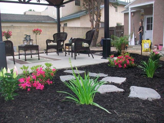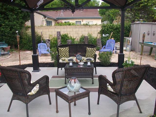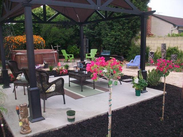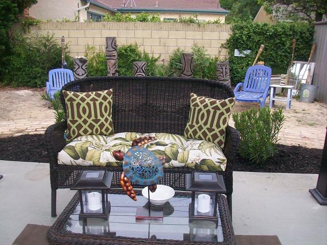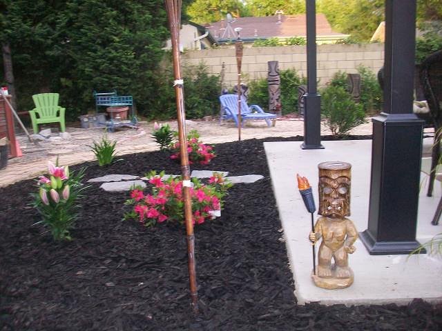 Thanks we had recreated the beach area back in October 2011 --but it was too large of a space.....So now there is just a little bit of beach in front of the Tikis and a Hawaii inspired patio area with black mulch around and tropical looking flowers. We hope to add more color and flower along the way... |